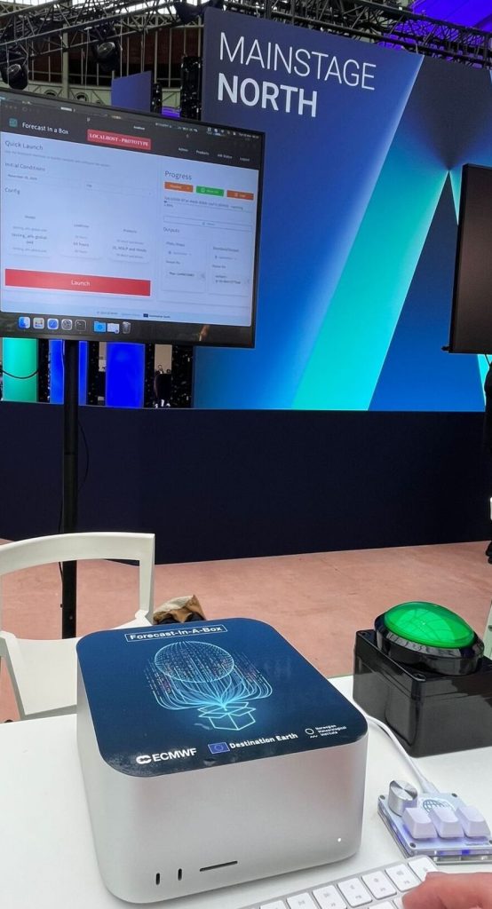 At the booth, scientists and Machine Learning experts from ECMWF engaged with visitors and explained the Centre’s AI activities, including those carried out under the Destination Earth initiative. The booth featured a hands-on demonstration of the “Forecast-in-a-Box” concept, showcasing how a complete AI-based forecasting system can be run on different computing infrastructures.