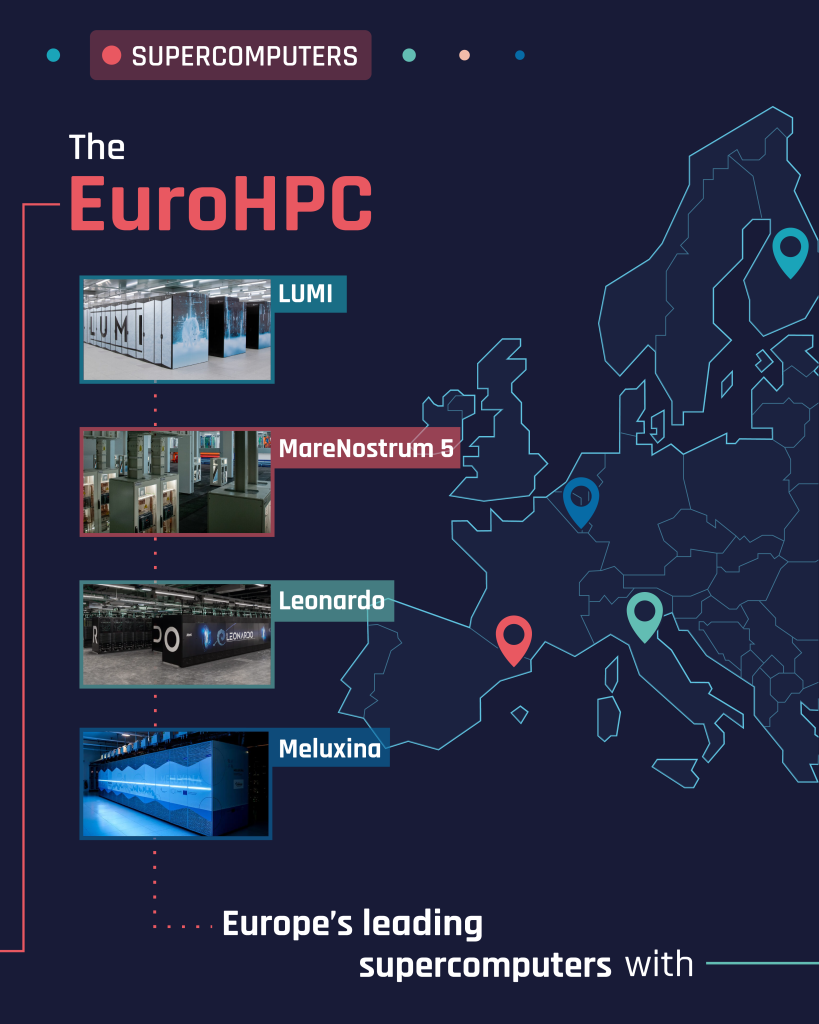 The implementation of DestinE is enabled by a strategic partnership with the European High Performance Computing Joint Undertaking (EuroHPC JU), which provides access to unprecedented computing power through several of its pre-exascale supercomputers and now also through the first exascale supercomputer in Europe, Jupiter. The other systems used are LUMI in Finland, Leonardo in Italy, MareNostrum5 in Spain, and MeluXina in Luxembourg.