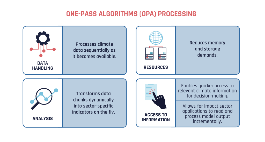 While one-pass algorithms (OPAs) have been used in fields like online trading and machine learning, their application in climate science is entirely new, pioneered within the Climate DT. Here, they enable the system to condense and translate massive volumes of complex climate data into sector-specific indicators and statistics, making the outputs both technically manageable and directly relevant for climate services and decision-making.